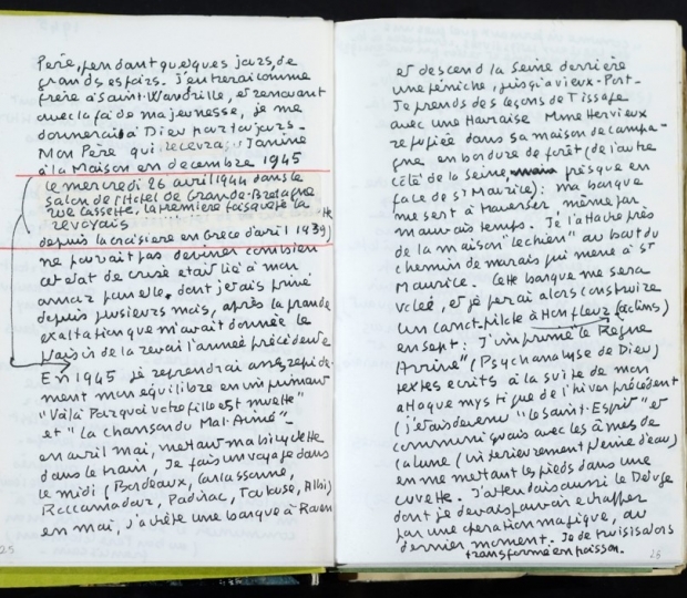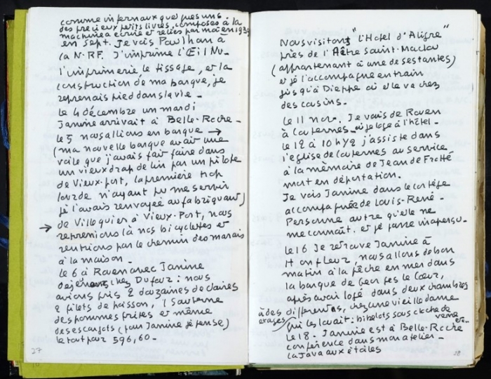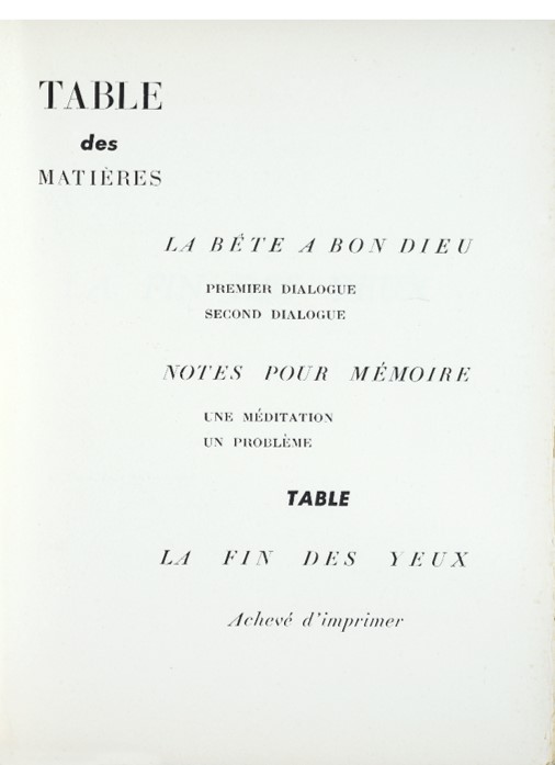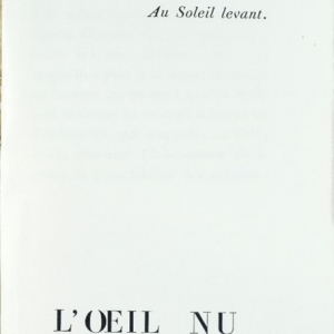 En sept. : j’imprime Le Règne arrive (Psychanalyse de Dieu) textes écrits à la suite de mon attaque mystique de l’hiver précédent (j’étais devenu « le Saint Esprit » et communiquais avec les âmes de la lune (intérieurement pleine d’eau) en me mettant les pieds dans une cuvette. […] Je détruisis alors comme infernaux quelques-uns des précieux petits livres, composés à la machine à écrire et reliés par moi en 1939. En sept. Je vois Paulhan à la NRF. J’imprime l’Oeil Nu. L’imprimerie, le tissage et la construction de ma barque, je reprenais pied dans la vie. [2]