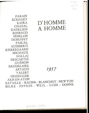 Paulhan de son côté travaillait fermement à me trouver un texte de Jouhandeau qui puisse me convenir. […] Dans cette collection, le texte de Chazal, d’Artaud me seront donnés par Paulhan. Et bien sûr sa Lettre aux médecins[1].