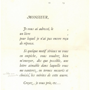 Je souhaite une bonne année à mon très charmant imprimeur. […] Je suis très ému à la pensée que vous allez composer ces chers textes mot après mot, caractère par caractère. Et ce sera très difficultueux car il est malaisé de couper les mots […] ça va être un travail de romain, vous verrez. [2]