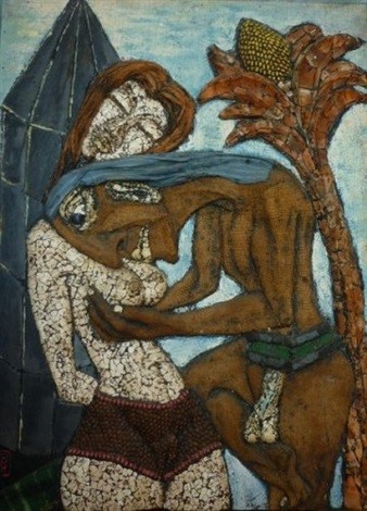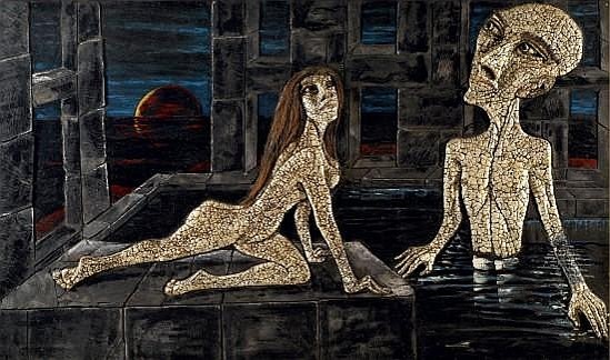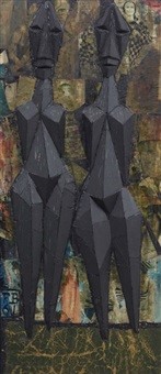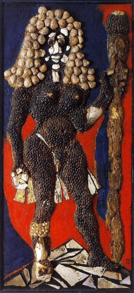 une œuvre puissante qui a l’apparence de grands hauts reliefs sculptés par quelque tribu inconnue, aux grâces du XVIIIe s. […] Ils appartiennent à une société venue du fond des âges, mais que nous n’identifions pas d’emblée, et pourtant ils sont proches de nous. […] figures totémiques […] fixées par l’artiste comme les monuments gigantesques qui balisent les sites des civilisations disparues. […] grand visionnaire. [1]