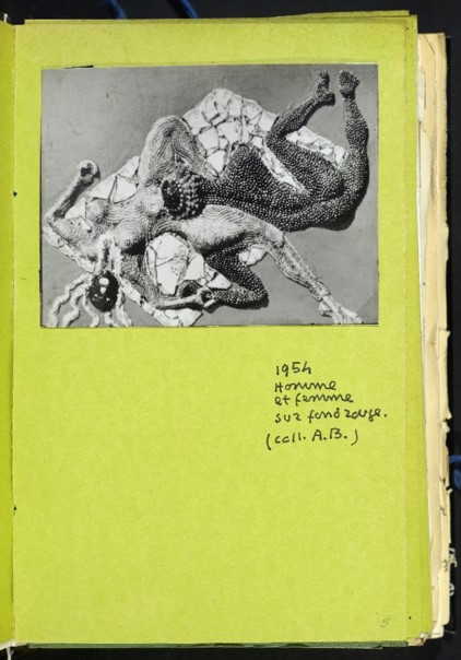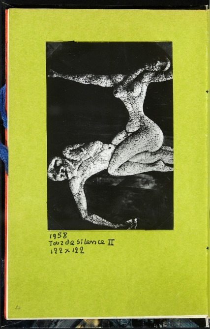 J'éprouvais une secousse érotique profonde à mimer les gestes de l'amour avec le matériel même de la vie. Et je gardais de ce premier contact, que certains tableaux de Matthias Grünewald raviveront, le projet de mêler plus étroitement l'os et la chair (une femme dont le bras seul décharné branlerait un membre viril) dans des compositions plus étoffées et dont mes hauts-reliefs aux personnages bien incarnés allaient m'ouvrir la carrière[2].
