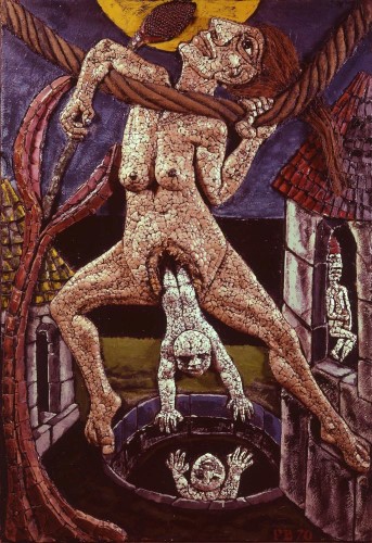 Ce que B exprime dans ses tableaux presque « vivants » et sans lesquels ils ne seraient peut-être qu’un Grand-Guignol pictural, c’est l’extraordinaire tension de l’être déchiré entre ses appétits fabuleux et l’aspiration à la transcendance.[1]