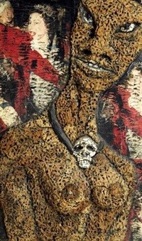 Afin de mieux attirer la femme désirée, il utilise pour elle par-dessus le panneau peint et un premier rembourrage en relief, des matières homologues comme grains de mais ou de café, soumises aux mêmes lois d'épanouissement de mûrissement et si l'on peut dire de cueillette... le sang, l'arrachement, et le viol n'étant pas loin, ce semble.[3]