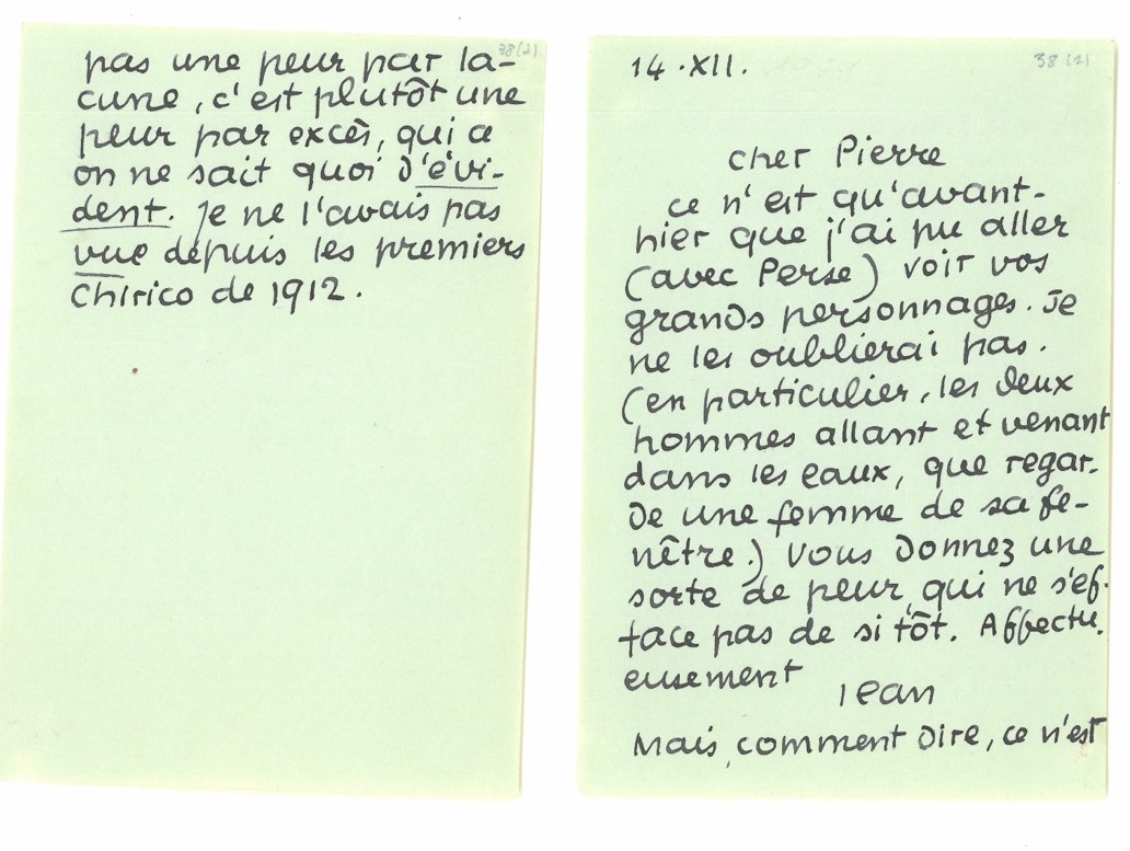 Cher Pierre, ce n’est qu’avant-hier que j’ai pu aller (avec Perse) voir vos grands personnages. Je ne les oublierai pas. […] Vous donnez une sorte de peur qui ne s’efface pas de sitôt. […] Mais comment dire, ce n’est pas une peur par lacune, c’est plutôt une peur par excès, qui a on ne sait quoi d’évident. Je ne l’avais pas vue depuis les premiers Chirico de 1912.[3]