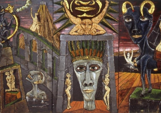 le Dieu d'or, (1961) s'offre à l'adoration devant le théâtre d'ombres des têtes mortes, des possibilités vaincues. Cette fois l'unité est conquise. Les supplices sont inutiles pour vous faire entendre raison : La décapitation même n'atteint plus le corps glorieux rayonnant de lumière intérieure, ayant rejeté l'agitation de la vie multiple pour l'immobilité sereine[1].